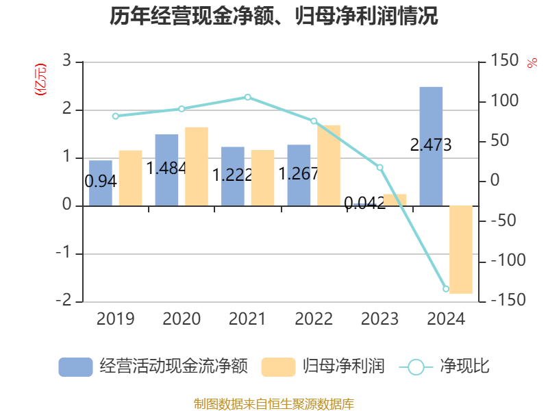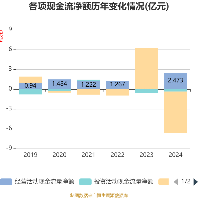 截至2024年,公司经营活动现金流净额为2.47亿元,同比增长5833.45%;筹资活动现金流净额-6.25亿元,同比减少12.45亿元;投资活动现金流净额-3673.74万元,上年同期为-6168.46万元。