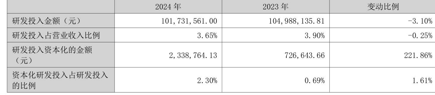 2024年全年,公司研发投入金额为1.02亿元,同比下降3.1%;研发投入占营业收入比例为3.65%,相比上年同期下降0.25个百分点。此外,公司全年研发投入资本化率为2.3%。