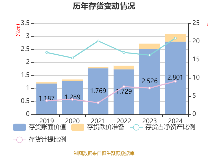 从存货变动来看,截至2024年末,公司存货账面价值为2.8亿元,占净资产的20.94%,较上年末增加2751.89万元。其中,存货跌价准备为2801.96万元,计提比例为9.09%。