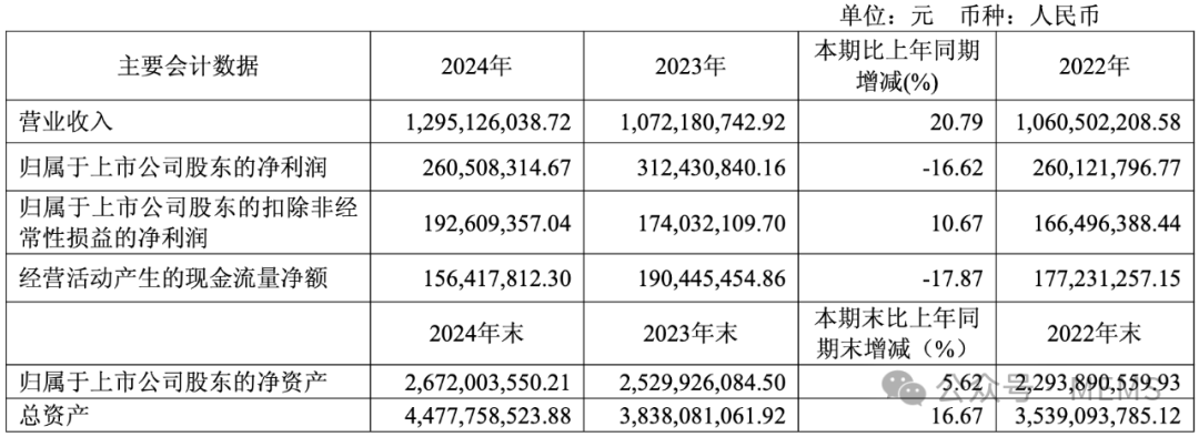 2024年,柯力传感实现营业收入129,512.60万元,比上年同期增长20.79%;实现归属于上市公司股东的净利润26,050.83万元,比上年同期减少16.62%;实现归属于上市公司股东的扣非净利润19,260.94 万元,同比增长10.67%。
