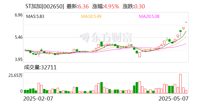 ST加加再度涨停,5个交易日内录得4个涨停,累计涨幅为24.95%,累计换手率为3.78%。截至9:26,该股今日成交量138.34万股,成交金额879.84万元,换手率0.12%。最新A股总市值达73.27亿元,A股流通市值73.26亿元。