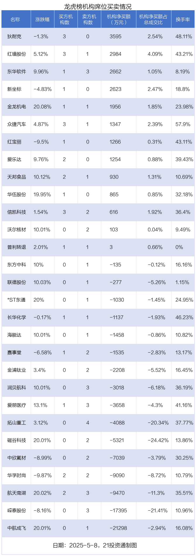 5月8日,29只个股龙虎榜出现了机构的身影,机构合计净卖出6.8亿元。具体来看,机构净买入13股,净卖出16股。