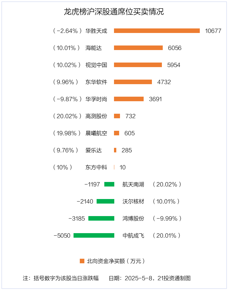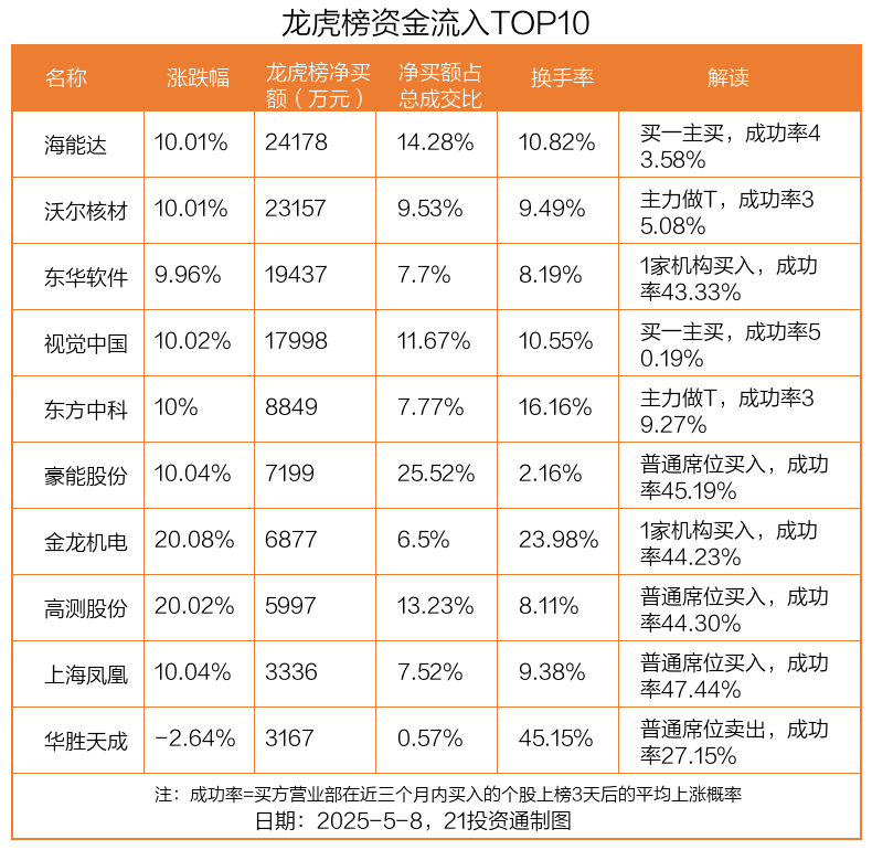 5月8日,上证指数上涨0.28%,深证成指上涨0.93%,创业板指上涨1.65%。盘后龙虎榜数据显示,共有51只个股因当日异动登上龙虎榜,资金净流入最多的是海能达(002583.SZ),达2.42亿元。
