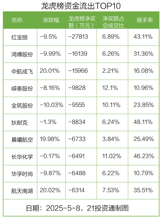 而龙虎榜中资金净流出最多的是红宝丽(002165.SZ),被净卖出为2.78亿元,占总成交金额的6.89%。红宝丽收盘下跌9.5%,换手率为43.11%。