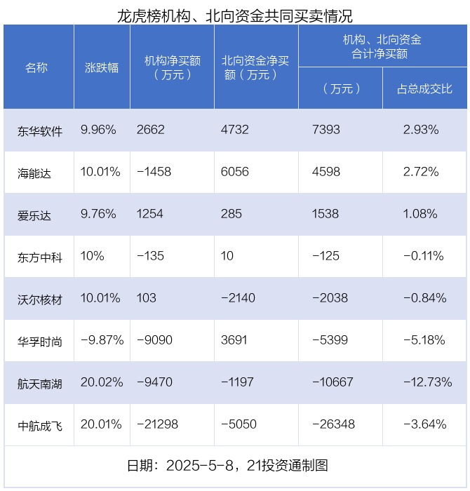 值得注意的是,机构和北向资金共同净买入了东华软件、爱乐达等2股;共同净卖出了航天南湖、中航成飞等2股;在海能达,华孚时尚,东方中科,沃尔核材上出现分歧,机构净卖出海能达1457.61万元,北向资金净买入6055.91万元;机构净卖出华孚时尚9089.67万元,北向资金净买入3690.94万元;机构净卖出东方中科134.89万元,北向资金净买入10.15万元;机构净买入沃尔核材102.82万元,北向资金净卖出2140.43万元。