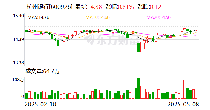 证券时报·数据宝统计显示,杭州银行今日收盘价为14.88元,上涨0.81%,日换手率为1.02%,成交额为9.59亿元,全天主力资金净流入722.75万元,近5日该股累计上涨1.29%,近5日资金合计净流出4216.09万元。
