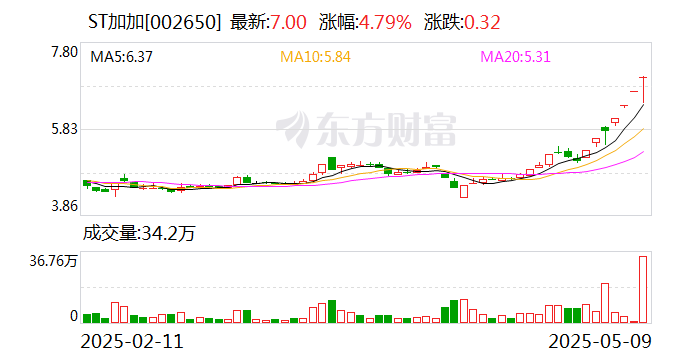 ST加加再度涨停,7个交易日内录得6个涨停,累计涨幅为37.72%,累计换手率为6.83%。截至13:51,该股今日成交量3161.54万股,成交金额2.16亿元,换手率2.74%。最新A股总市值达80.76亿元,A股流通市值80.75亿元。