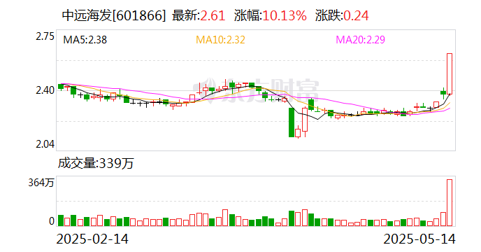 中远海发(601866)今日涨停,全天换手率3.45%,成交额8.55亿元,振幅10.59%。龙虎榜数据显示,机构净卖出583.26万元,沪股通净买入2193.00万元,营业部席位合计净买入3632.29万元。