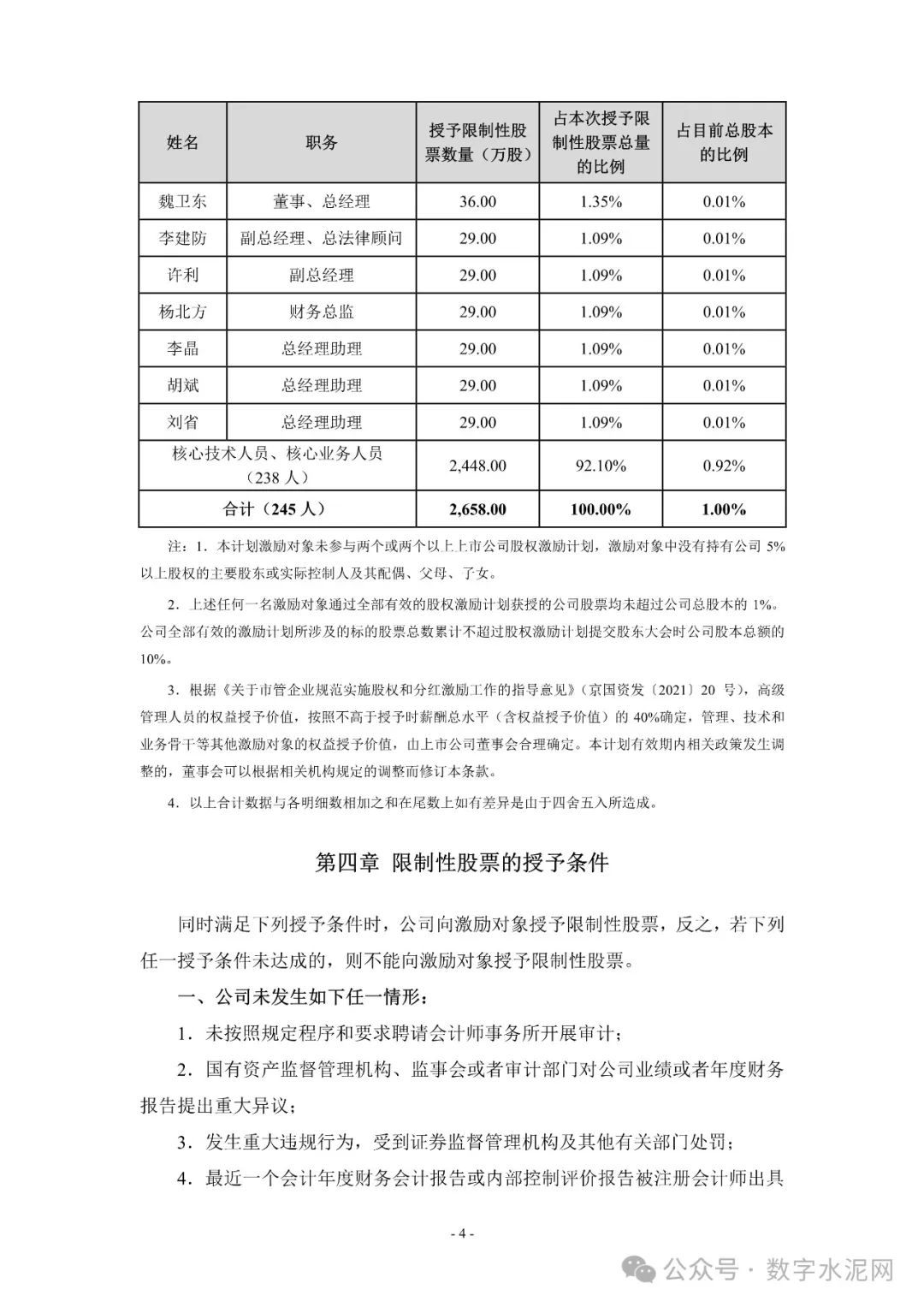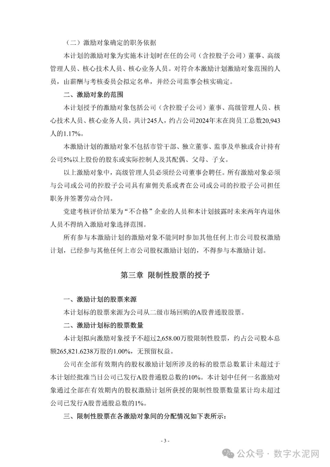 日前,冀东水泥召开董事会及专门委员会、监事会,审议通过股权激励草案等6项议案,公司拟对包括董事、高级管理人员、核心技术人员、核心业务人员在内共计245人以限制性股票方式进行股权激励。股权激励的授予股票数量不超过2,658万股,授予价格为每股3.41元,股票来源为公司已回购的股票,激励对象获授的限制性股票将在2026-2028年三个考核年度达成各项业绩指标后分三批解除限售。