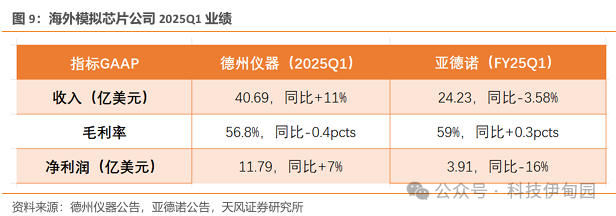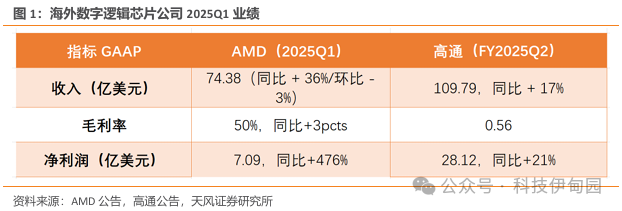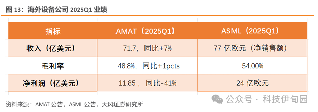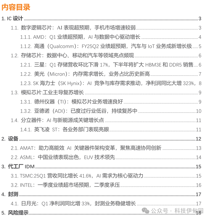 2025Q1(部分公司为FY25Q1),大部分海外及中国台湾半导体龙头公司表现出色。数字逻辑芯片板块,AMD 净利润7.09 亿美元(+476% yoy),高通净利润 28.12 亿美元(+21% yoy)。存储芯片板块,三星存储业务营收环比-17%,美光营收80.53 亿美元(+38% yoy),SK 海力士净利润 8.11 万亿韩元(+323% yoy)。模拟芯片板块,TI净利润 11.79 亿美元(+7% yoy)。分立器件板块,英飞凌 ST 营收35.91 亿欧元。设备板块,AMAT 营收71.66亿美元(+7% yoy),ASML净利润 24 亿欧元。代工厂 IDM 板块,台积电净利润新台币 3,615.6 亿元(+60.3% yoy),英特尔营收127 亿美元(yoy持平)。封测板块,日月光归属公司主业净利润75.54 亿元新台币(+33% yoy)。
