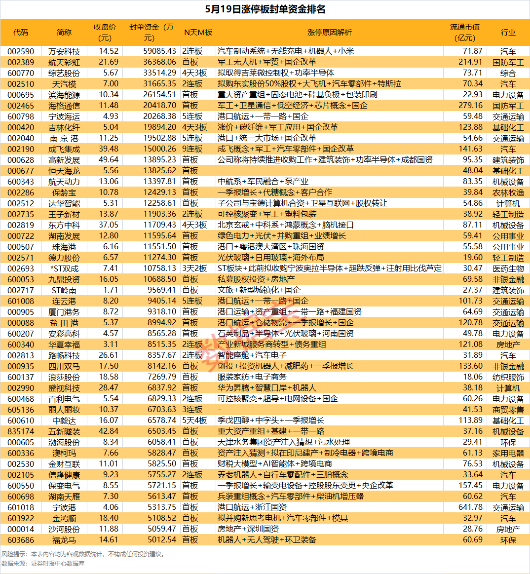 从收盘涨停板封单量来看,综艺股份最受资金追捧,收盘涨停板封单有5910.81万股,其次是ST岭南、天汽模等,涨停板封单分别有5596.15万股、4523.62万股。以封单金额计算,万安科技、航天彩虹、综艺股份等涨停板封单资金较多,分别有5.91亿元、3.64亿元、3.35亿元。
