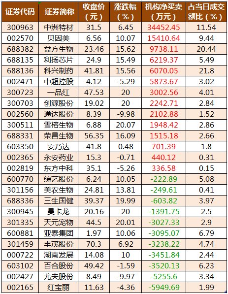 龙虎榜机构净买入14股中洲特材居首盘后龙虎榜数据显示,今日机构席位资金合计净买入约6亿元。其中,净买入的个股14只,净卖出的个股11只。机构净买入最多的股票是中洲特材,净买入金额约3.45亿元;机构净买入居前的还有贝因美、益方生物、利扬芯片等股。机构净卖出最多的股票是红宝丽,净卖出金额约5949.69万元;机构净卖出居前的还有尤夫股份、百合股份等股。