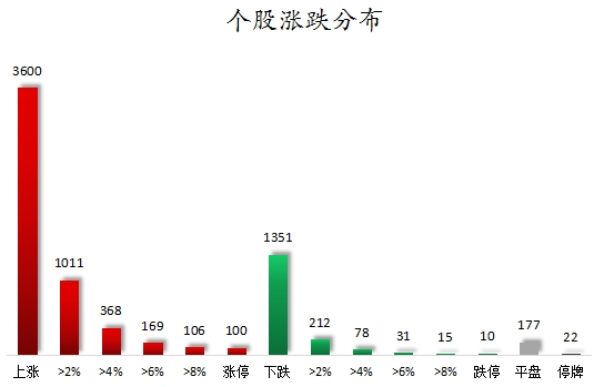 个股涨跌情况,截至收盘,沪深两市合计3600只个股上涨,1351只个股下跌,平盘个股177只,停牌的个股22只。不含当日上市新股,共有100只个股涨停,10只个股跌停。