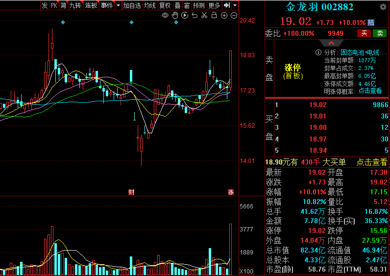 二级市场上,5月20日金龙羽强势涨停,涨幅为10.01%,收盘报19.02元/股,当前总市值为82.34亿元。