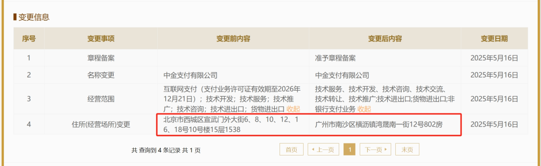 支付之家网获悉,持牌支付机构中金支付有限公司(简称“中金支付”)近日发生系列工商变更,经营场所由“北京市西城区”变更为“广州市南沙区”。
