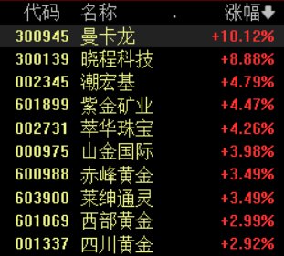 5月21日,A股黄金概念股开盘强势领涨,盘中震荡整理,截至发稿,曼卡龙涨逾10%,晓程科技涨8%,潮宏基、紫金矿业、萃华珠宝(维权)涨超4%,莱绅通灵、四川黄金等跟涨。