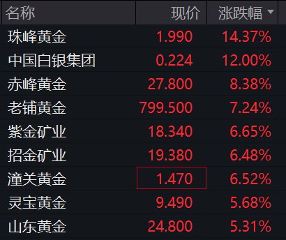 港股黄金股走强,截至发稿,珠峰黄金涨超14%,赤峰黄金涨8%,老铺黄金涨7%,紫金矿业、招金矿业涨6%。