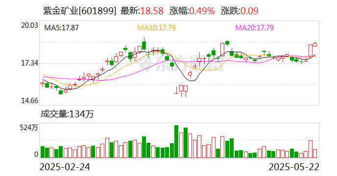 证券时报·数据宝统计显示,紫金矿业今日收盘价为18.58元,上涨0.49%,日换手率为0.65%,成交额为24.75亿元,全天主力资金净流入5432.14万元,近5日该股累计上涨6.23%,近5日资金合计净流入1.63亿元。