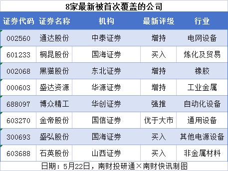 首次覆盖方面,5月22日券商共给出了8次首次覆盖,其中通达股份获得中泰证券给予“增持”评级,桐昆股份获得国海证券给予“买入”评级,黑猫股份获得东北证券给予“增持”评级,盛达资源获得华源证券给予“增持”评级,博众精工获得华创证券给予“强推”评级。