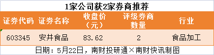 从券商推荐家数来看,5月22日有46家上市公司得到券商推荐,其中安井食品获得2家推荐,内蒙华电获得1家推荐,奥拓电子获得1家推荐。