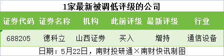 评级调低方面,5月22日,券商调低上市公司评级达到1次,最新数据包括了山西证券对德科立的评级从“买入”调低至“增持”。