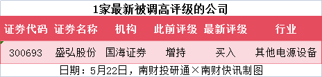 评级调高方面,5月22日,券商调高上市公司评级达到1次,最新数据包括了国海证券对盛弘股份的评级从“增持”调高至“买入”。