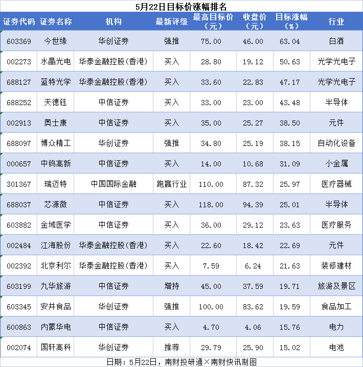5月22日,券商给予上市公司目标价共16次,按当日收盘价计算,目标价涨幅排名居前的公司有今世缘、水晶光电、蓝特光学,目标价涨幅分别为63.04%、50.63%、47.17%,分别属于白酒、光学光电子、光学光电子行业。