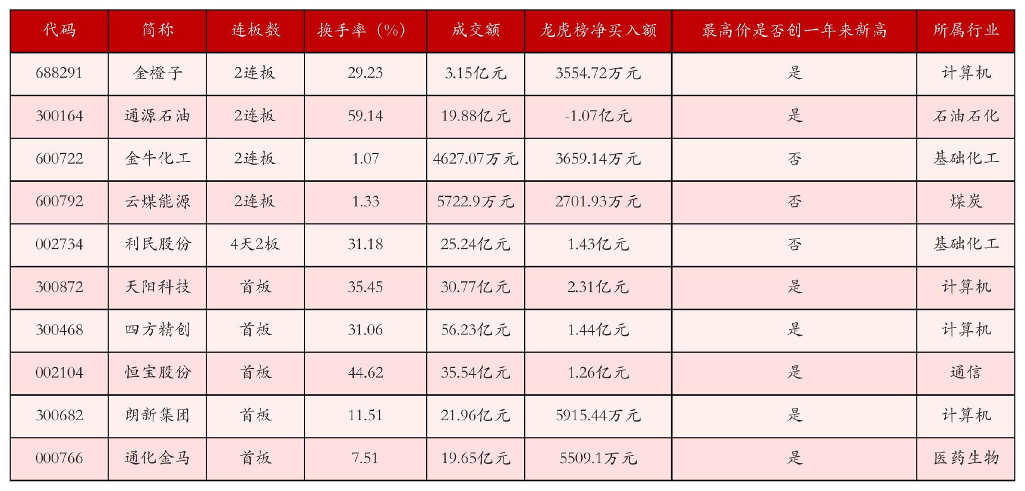 截至6月16日收盘,上证综指上涨0.35%,收于3388.73点,深证成指上涨0.41%,收于10163.55点,创业板指上涨0.66%,收于2057.32点。今日沪深两市A股共计75只涨停,综合当前连板数以及当日龙虎榜数据,其中较为强势的前三只个股分别为:金橙子(688291)、通源石油(300164)与金牛化工(600722)。今日强势个股前10位具体数据见下表: