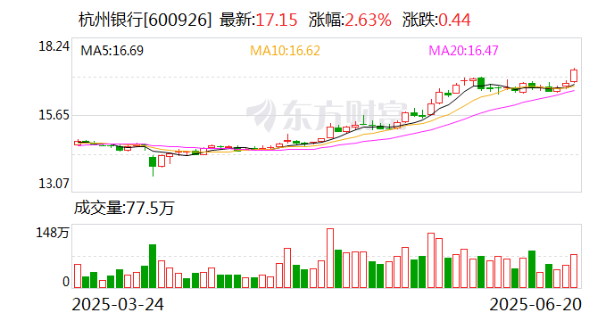 证券时报·数据宝统计显示,杭州银行今日收盘价为17.15元,上涨2.63%,日换手率为1.08%,成交额为13.21亿元,全天主力资金净流入7500.81万元,近5日该股累计上涨3.81%,近5日资金合计净流入2.30亿元。