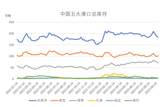 截止2023年9月28日,中国纸浆主流港口样本库存量:183.4万吨,较上期下降3.5万吨,环比下降1.9%,库存量在过去三个周期去库后继续去库的趋势。本周期纸浆国内主流港口青岛港库存呈现窄幅去库的趋势,港上出货速度较上周期变动不大,日均出货1.3万吨左右,到港量较上周期没有较大增量,港上整体呈现窄幅去库的状态。本周期常熟港库存量继续呈现窄幅去库的局面,出货数量较上周期增加,周期内累计出货超过12万吨。整体来看,港口库存处于年内中高位水平,本期国内主流港口样本库存呈现去库的状态。