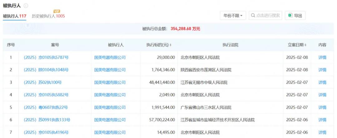 天眼查信息显示,截至2月10日,关联的国美电器有限公司,共有117条被执行人信息,执行标的合计35.43亿元。