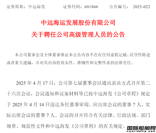 公告指出,2025年4月17日,中远海发第七届董事会以通讯表决方式召开第二十六次会议,经董事会一致审议通过《关于聘任本公司高级管理人员的议案》,同意聘任张明明先生为公司副总经理,即日生效。