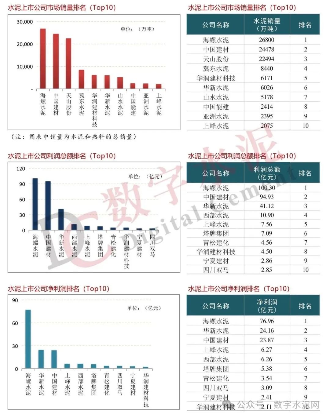 水泥销量(水泥和熟料的总销量);利润总额(税前利润);净利润(归属于上市公司股东的净利润);资产(指上市公司总资产);市值(拥有多种类型股票上市的,以总市值计)。