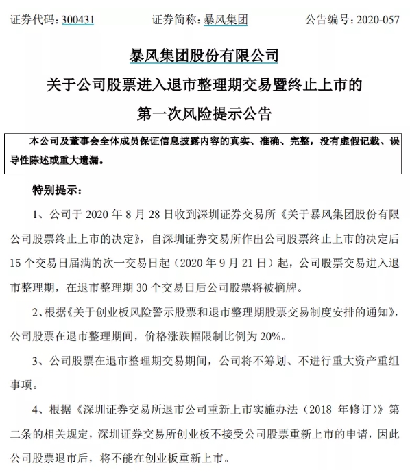 9月19日消息,暴风退发布公告称,公司于2020年8月28日收到深交所《关于暴风集团股份有限公司股票终止上市的决定》。自9月21日起,公司股票交易进入退市整理期,在退市整理期30个交易日后公司股票将被摘牌。