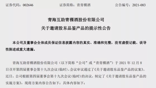 青青稞酒表示,公司于2011年12月22日在深圳证券交易所上市,多年来深受广大股东信任和支持,为了深入了解消费者的需求,不断提升产品品质,公司决定开展邀请股东品鉴产品的活动。