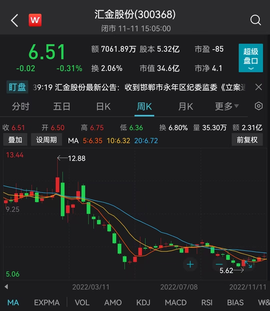 2020年,汇金股份一度被作为数字货币概念股而热炒,股价一个月翻番,但此后持续下滑。截至今年11月11日,汇金股份报6.51元/股,市值34.6亿元。