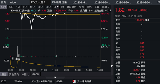 6月20日是光一退进入退市整理期交易的首日,公司股价下跌80.70%。但随后,剧情出现惊天反转——6月21日、26日、27日连续三日“一字”涨停,28日盘中上演“深V”反转。