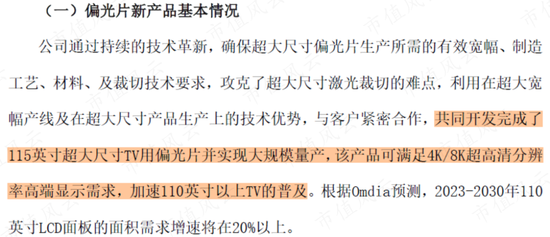 偏光片业务则凭借超大尺寸、超薄化、高对比度、广视角等差异化技术领先市场,特别是65寸以上大尺寸偏光片的全球市占率超40%,80寸以上的全球市占率高达80%以上。