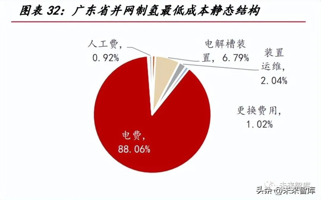 多地政策从生产直接补贴、电价补贴、电力交易政策、资源配套等方面对电氢项 目给予扶持,以改善电氢系统经济性。1)直接补贴,现有地方政策规定首年按照 15 元/kg 给予补贴,补贴额度按比例 逐年退坡,如吉林省、濮阳市;2)电价优惠,或给予一定电力交易政策支持,如深圳市、攀枝花市,以深圳市 “电解制氢设施谷期用电量超过 50%的免收基本电费”政策为例,如果按照谷用电进 行控制,并以前文广东省电费占比进行测算,则该政策可减少约 75%电解水制氢成本;3)资源配套,主要是风电光伏开发资源,如湖北省、濮阳市。