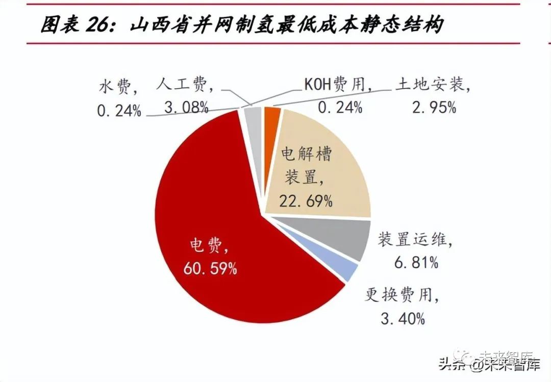 山西省经济利用小时数为 1915 小时,并网制氢单位成本最低:截止 2022Q3,山 西省风电光伏装机量占比位列全国第 14,但由于负荷较少,山西省低电价小时数在 五个省份中较为显著, 0~0.05 元/kWh 共计 1341 小时,0.3~0.35 元/kWh 共计 1219 小时,低电价优势明显。经过我们的测算,当利用小时数为 1915 小时,综合电价 0. 1868 元/kWh,山西制氢成本最低为 15.2 元/kg,考虑氧气售后冲减费用,制氢成本 下降至 9.6 元/kg。山西省并网制氢成本结构中,因现货市场低电价优势显著,电费 占比相对较低,仅 60.59%,电费之中,电能量价格占 42%,输配容量价格占 36%。