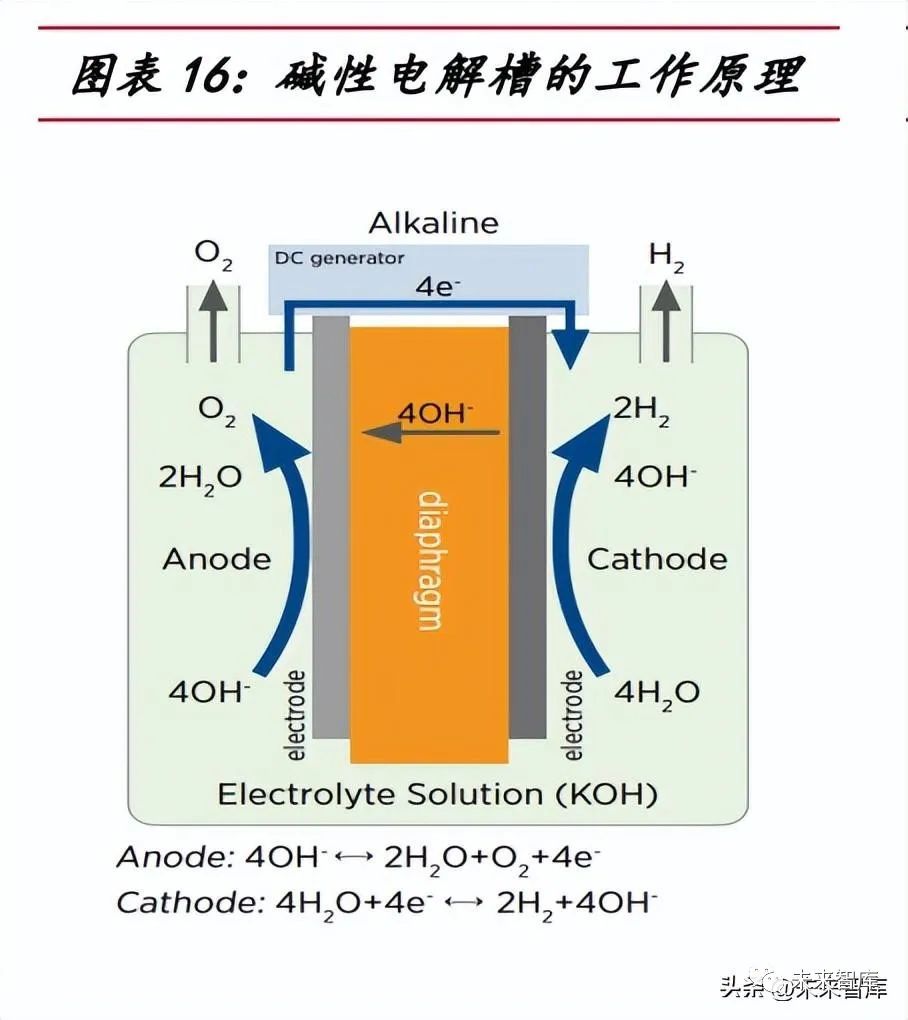 按照工作原理和电解质的不同,电解水制氢技术可分为 4 种。碱性电解水技术 (ALK)、质子交换膜电解水技术(PEM)、高温固体氧化物电解水技术(SOEC)和固体聚合物阴离子交换膜电解水技术(AEM)。其中,碱性电解槽的成本较低,经济性较好,2022 年国内碱性电解槽出货占 97%,但相较于 PEM 的灵活性较差,PEM 受限于质子膜高成 本,总体设备成本是碱性电解槽 3-4 倍。碱性电解槽的电解液一般为 30%质量浓度的 KOH 溶液或者 26%质量浓度的 NaOH 溶液。在直流电的作用下,阴极发生还原反应,生成氢气和氢氧根离子,阳极发生氧 化反应,生成氧气和水。经过气水分离器将气体和溶液分离,电解液回流至电解槽, 氢气和氧气分别进入纯化装置提纯后进行收集。
