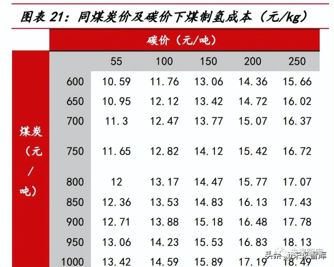 若考虑碳排放价格,化石能源制氢经济性进一步下降。根据 IEA,煤制氢路线 1kg 氢气产生约 26kg 二氧化碳、天然气制氢路线 1kg 氢气产生约 10kg 二氧化碳,按照当 前中国碳排放价格为 55 元/吨计算,考虑碳价后煤制氢、天然气制氢成本将分别达到 12.7 元/kg、22.3 元/kg,在碳减排压力下,碳配额发放或将收紧,推动碳价上行, 当碳价上涨至 200 元/吨时,煤制氢、天然气制氢成本将分别达到 16.5 元/kg、23.8 元/kg,电解水制氢相对化石能源制氢或将更具经济优势。