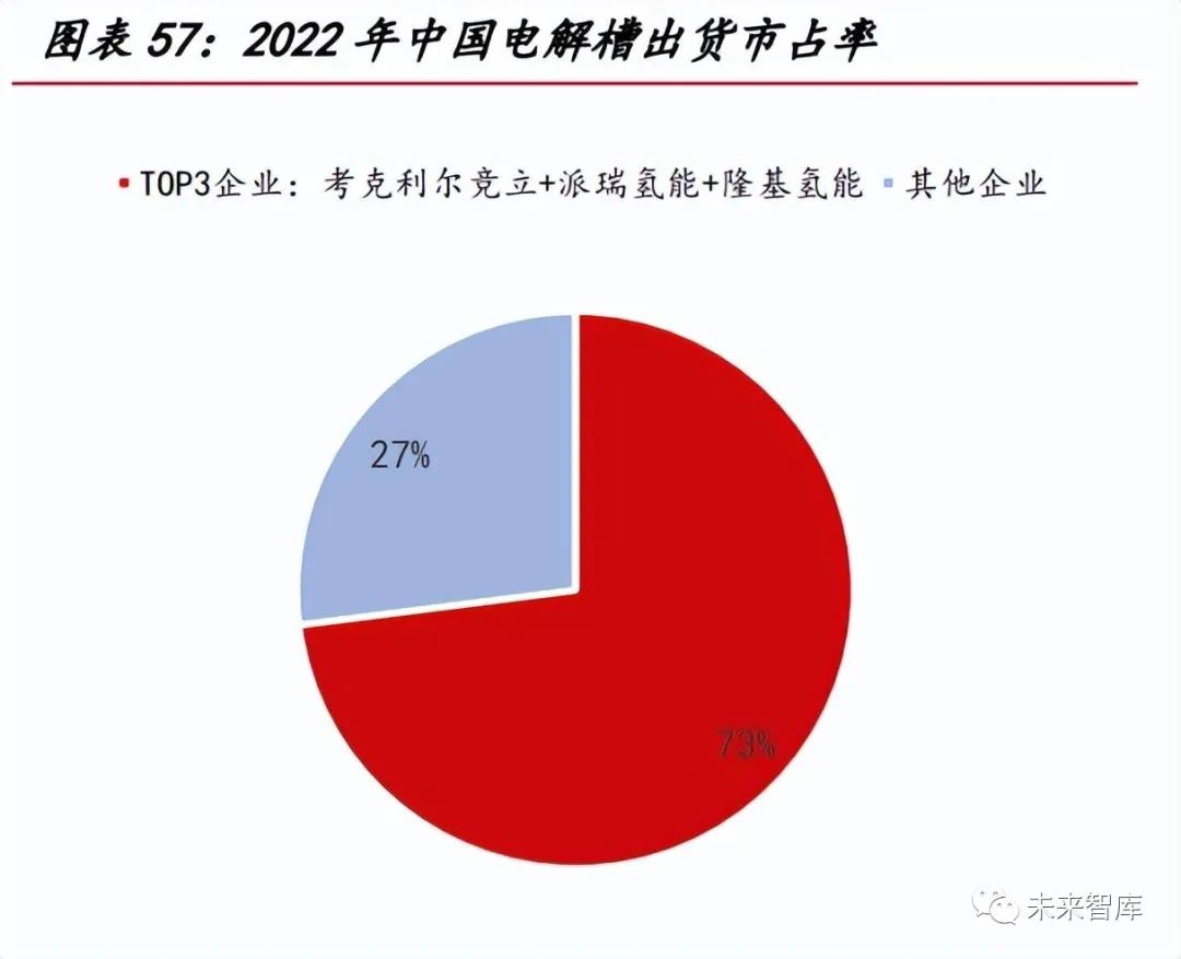 电氢赛道风起云涌,电解槽系统率先放量,2022 年国内电解槽设备出货量同比 2021 年翻倍。2021 年之前,聚焦电解水制氢设备制造的厂商主要包括派瑞氢能、考 克利尔竞立、天津大陆等深耕多年的头部企业,2021 年起,风电、光伏、氢能产业链 企业先后布局电解槽业务,行业出货量大增。据 GGII 统计,2021/2022 年中国电解 水制氢设备出货量分别约 350MW/722MW。电解槽行业仍处于高速增长阶段,竞争格局尚不稳定。2021 年,考克利尔竞立 (出货量 160MW)、派瑞氢能、山东赛克赛斯氢能位居电解槽出货量前三;2022 年考 克利尔竞立(出货量 230MW,占比 31.9%)、派瑞氢能、隆基氢能(首次切入前三)位 居出货量前三,行业 CR3 达 73%,同比 2021 年下降约 10 个百分点。从产能来看,据势银 (Trend Bank)统计,2022 年中国碱性电解槽企业已披露产 能接近 11GW,质子交换膜制氢设备的产能已超过百兆瓦级。碱性电解水制氢路线相 对成熟,投资成本低,当前占据主导地位。