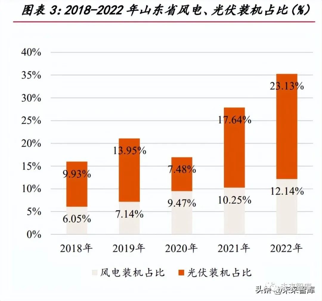 在新能源占比较高的地区,相应时段电价较低。由于新能源发电边际成本低的特 质,在新能源高发期间,如果用电需求较低,则相应时段市场电价较低。以山东省电 力现货市场为例:2018-2022 年,山东省风电、光伏装机容量及发电量持续增长,风电、光伏装机 容量自 1146/1361 万千瓦增长至 2302/4270 万千瓦,CAGR 达 14.97%/25.69%,风电、 光伏装机占总装机量比例自 6.05%/9.93%扩张至 12.14%/23.13%;风电、光伏发电量 占总发电量比例自 2.32%/0.55%扩张至 5.28%/11.25%。