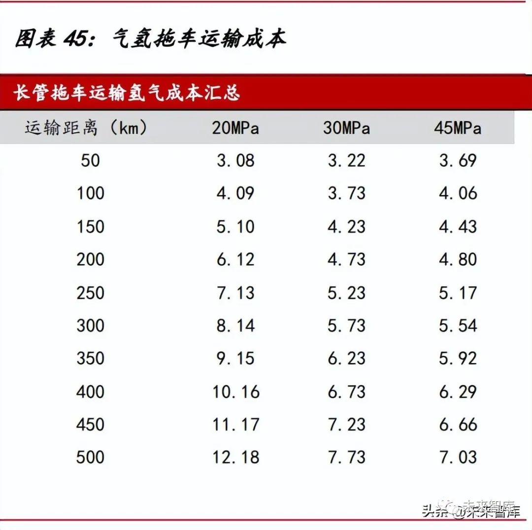 气氢拖车是目前国内最成熟的氢气运输形式,我国氢气管束式集装箱和氢气长管 拖车大多采用钢制大容积无缝高压气瓶和钢制内胆碳纤维环向缠绕气瓶,工作压力通 常为 20Mpa,单次运输氢气质量小,运输效率低,适用于 200 公里以内的短距离运输。综合市场上管束式氢气集装箱的平均输氢量,假设 20/30/45MPa 管束式集装箱最大可 运输氢气质量 340/650/950 千克,管束式集装箱费用 60/70/80 万,单位压缩电耗 2/4.5/6kWh/kg,则运距 500 公里的运输成本高达 7 元/kg 以上。