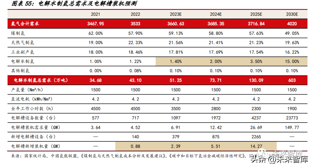 电氢渗透率有望加速提升。随着电氢经济性提升及国家政策鼓励,电氢占比有望 持续提升,进而推动电解水制氢系统需求高增。根据我们测算,假设 2023-2025 年电 解水制氢渗透率分别为 1.4%/2%/3.5%,并假设单套制氢系统产氢量为 1500 方/h,则 新增电解槽分别达 379/875/2265 台,对应装机需求约为 2.4/5.5/14.3GW。