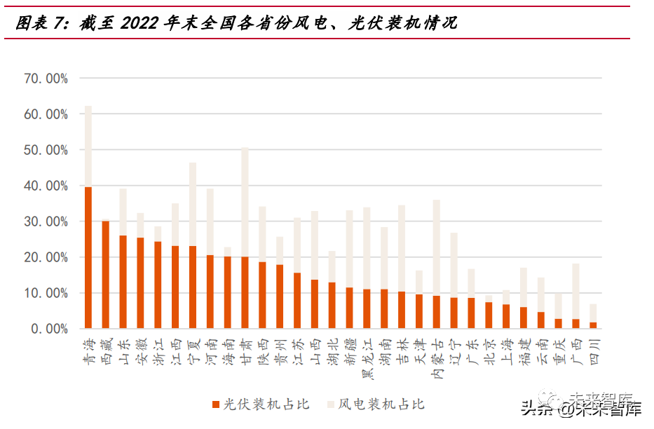 截至 2022 年末,全国各省风电、光伏装机量占各省总装机量比例前五名的为青 海、西藏、河北、宁夏、安徽(按光伏装机排序);全国各省风电、光伏发电量占各 省总发电量比例前五名的为青海、西藏、宁夏、甘肃、山东。考虑到新能源渗透率与分时电价特征高度相关,因此全国多个省份均可出现类似 山东省的电价分时特征,如青海、宁夏、甘肃等。