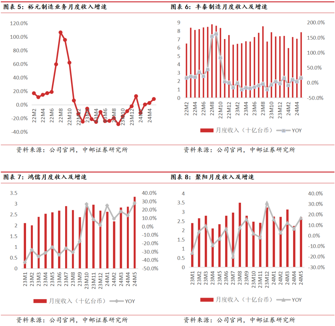 裕元/丰泰/儒鸿/聚阳24年5月收入增速分别为8.3%/16.6%/27.8%/16.6%,5月台企订单高增。根据台企公司公告,裕元/丰泰24年5月收入增速分别为8.3%/16.6%,24年1-5月累计增速为2.3%/8.1%,儒鸿/聚阳24年5月收入增速分别为27.8%/16.6%,24年1-5月累计增速为18.8%/10.6%。头部鞋履、成衣制造公司5月订单高景气度。