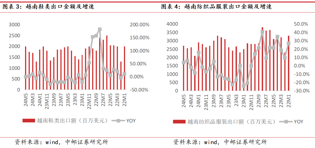 越南鞋类/纺织品服装类24M5出口金额同增0%/3.9%。根据wind、越南统计局数据,越南鞋类/纺织品服装类24M5出口金额20亿美元/27亿美元,同比+0%/+3.9%,24年1-5月出口总额分别为86亿美元/128.5亿美元,同比+3.0%/+3.2%。