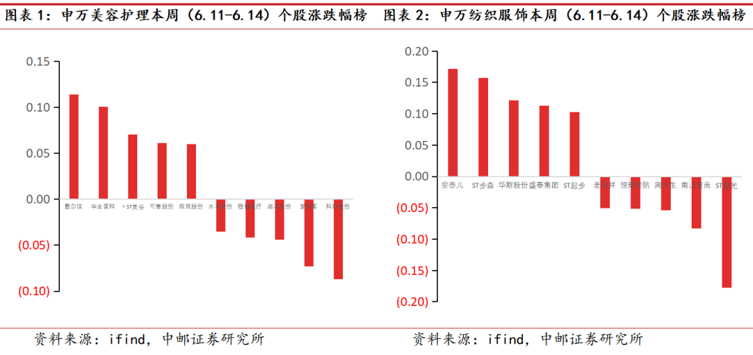 (1)行情回顾:本周(6月11日-6月14日)申万美容护理指数下跌2.06%,申万纺织服饰指数上涨0.18%,上证综指下跌0.53%,美护跑输大盘,纺织跑赢大盘;年初至今,申万美容护理指数下跌10.20%,申万纺织服饰指数下跌11.15%,上证综指上涨1.94%,美护纺服均跑输大盘。从个股表现来看,本周申万美容护理板块中敷尔佳、华业香料、*ST美谷(维权)、可靠股份、依依股份涨幅靠前;本周申万纺织服饰板块中安奈儿、ST步森(维权)、华斯股份、盛泰集团、ST起步等涨幅靠前。